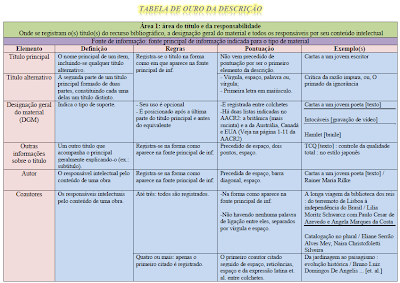 Foi pensando nisso que, nessa 4ª Biblio Lição, surgiu uma tabela carinhosamente chamada de Tabela de Ouro da Descrição. As regras gerais aplicáveis às oito áreas da descrição estão distribuídas em uma tabela de visualização rápida e fácil. A indico até aos que não necessariamente estejam estudando para concurso. Ficou legal demaaaais. Demorou, mas valeu a pena a espera, viu. 🙂